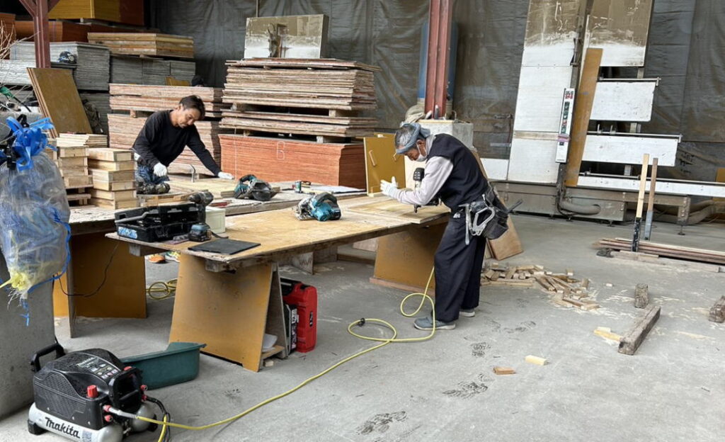 拾い出し作業で作成した加工図をもとに、ベニヤ板・桟木を切断して型枠を製作します。工具は、ハンマー、釘打機、電動丸ノコを使って製作します。