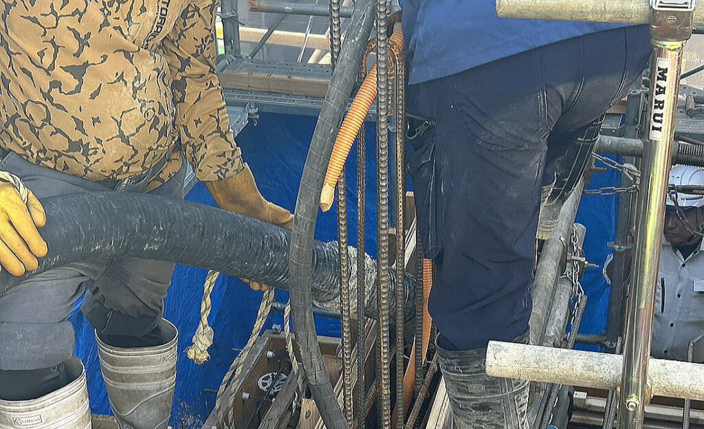 建込した型枠の中にコンクリート流し込みます。コンクリート打設は別の業者が行いますが、流動性のあるコンクリートを流し込むため、型枠にはかなりの圧力がかかるので、打設前点検及び打設中の型枠の点検は型枠大工の重要な仕事です。